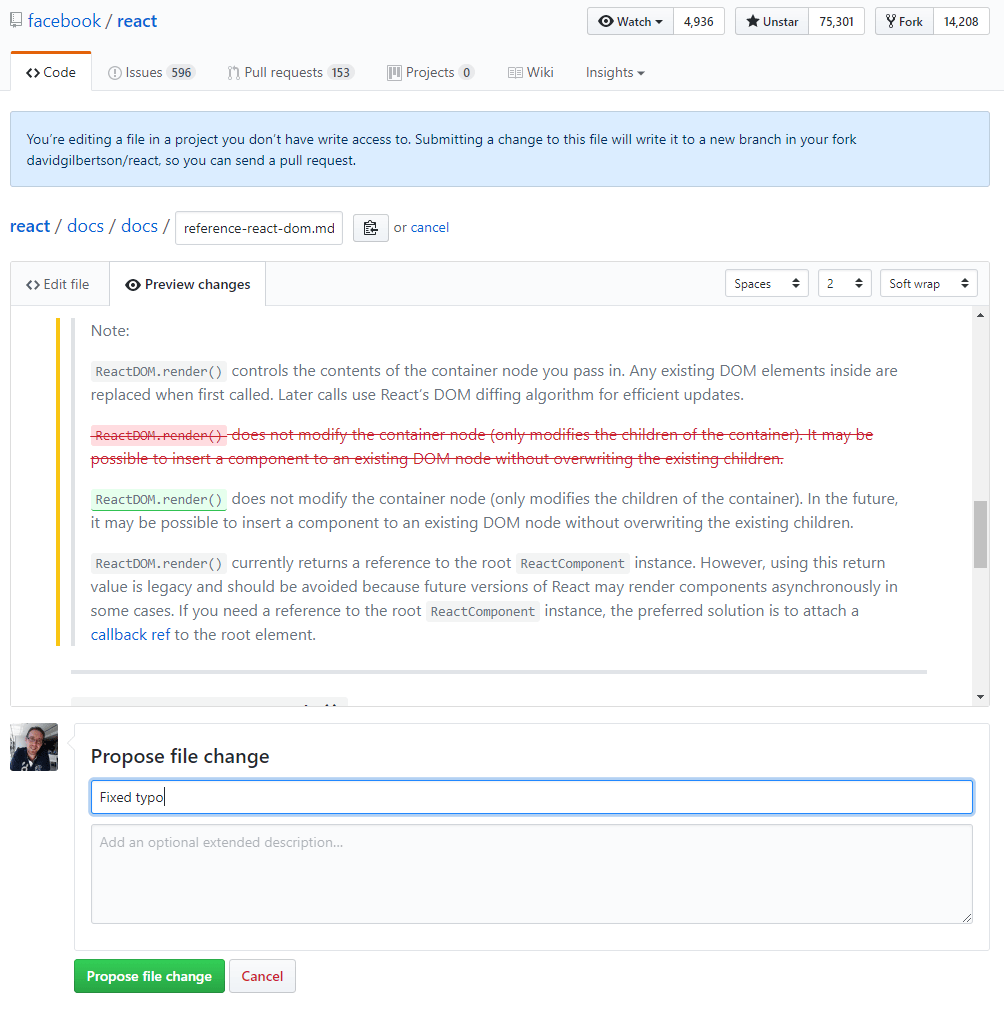 当你登录到 GitHub ,查看一个文件时(任何文本文件,任何版本库),右上方会有一只小铅笔。点击它,你就可以编辑文件了。 当你编辑完成后,GitHub 会给出文件变更的建议,然后为你 复刻 该仓库并创建一个 拉取请求 (PR)。