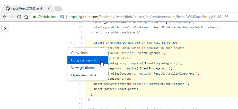 分享这个 URL 将会链接到这个文件的那些行。但等一下,链接所指向的是当前分支。如果文件发生变更了怎么办?也许一个文件当前状态的 永久链接 就是你以后需要的。