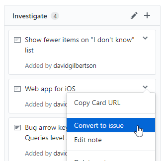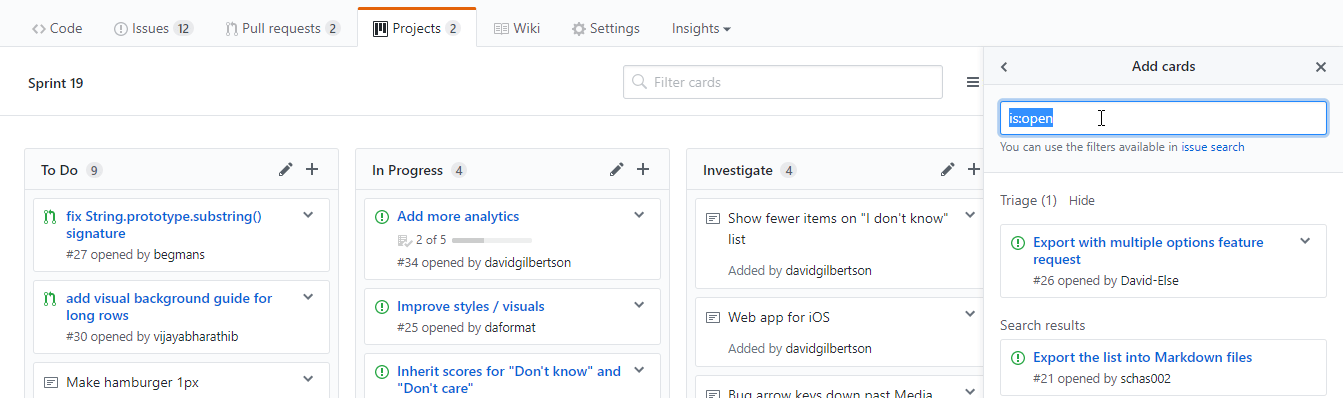 你可以点击右上角的 添加卡片 ,然后找你想要添加的东西。在这里,特殊的搜索语法就派上用场了,举个例子,输入 is:pr is:open 然后现在你可以拖动任何开启的 PR 到项目面板上,或者要是你想清理一些 bug 的话就输入 label:bug。