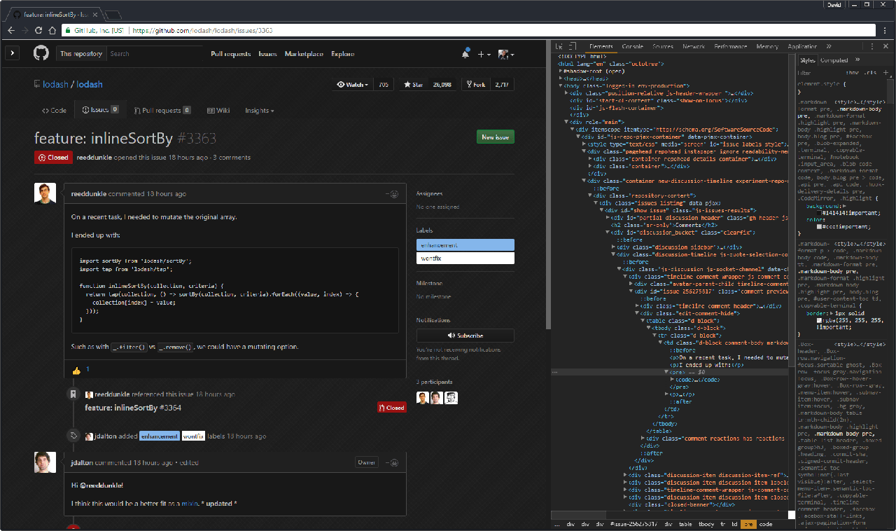 这是由 Chrome 扩展 Stylish(它可以在任何网站使用主题)和 GitHub Dark 风格的一个组合。要完全黑化,那黑色主题的 Chrome 开发者工具(这是内建的,在设置中打开) 以及 Atom One Dark for Chrome 主题你肯定也需要。