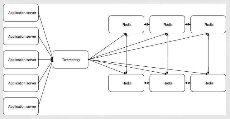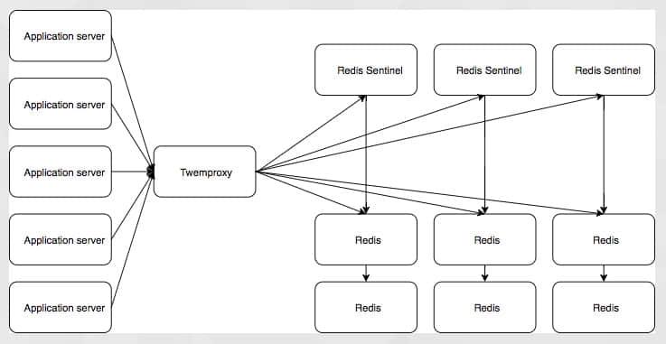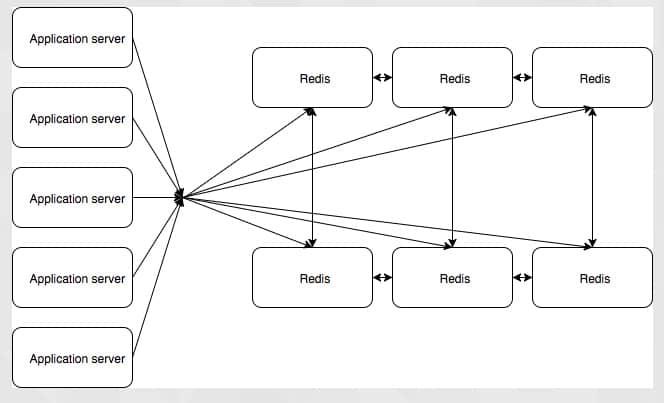 将会有大量的应用服务器与 twemproxy 进行通信,这会将它们的调用路由到合适的 Redis 主节点,twemproxy 将从 sentinal 集群获取主节点的信息,它将控制哪台 Redis 实例是主,哪台是从。这个设置是复杂的,而且仍有单点故障,它依赖于 twemproxy 来处理分片,来连接到正确的 Redis 实例。它具有对应用程序透明的优点,所以我们可以在理论上做到将现有的应用程序转移到这个 Redis 配置,而不用改变应用程序。但是我们要从头开始构建一个应用程序,所以迁移应用程序不是一个必需条件。