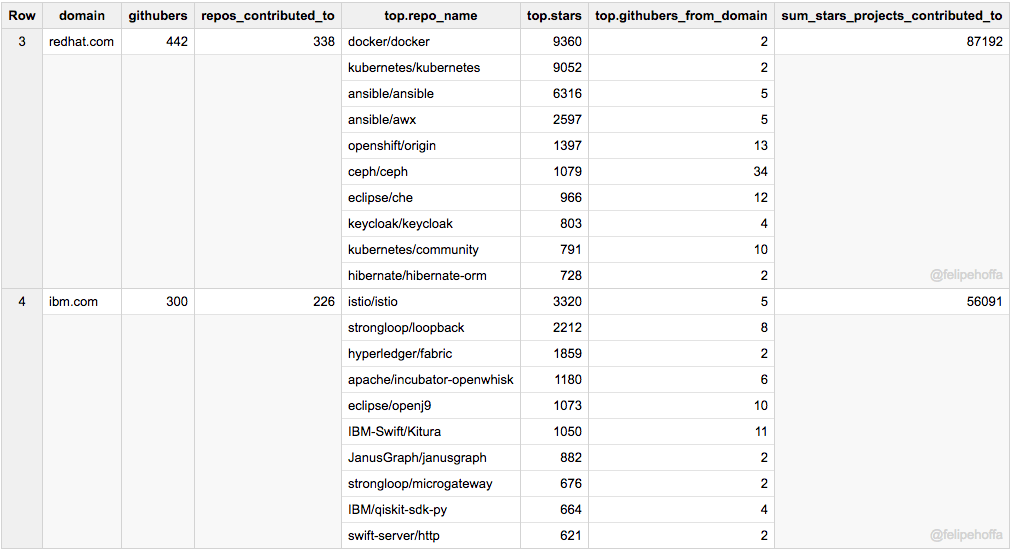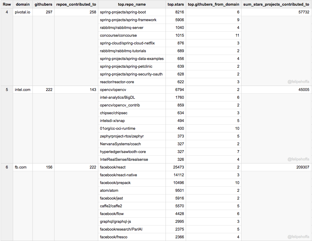在 GitHub 上判定每个用户所属的公司并不容易,但是我们可以使用其推送事件的提交消息中展示的邮件地址域名来判断。