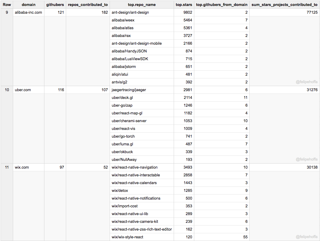 (LCTT 译注:很高兴看到国内的顶级互联网公司阿里巴巴、腾讯和百度在这里排名前列!)