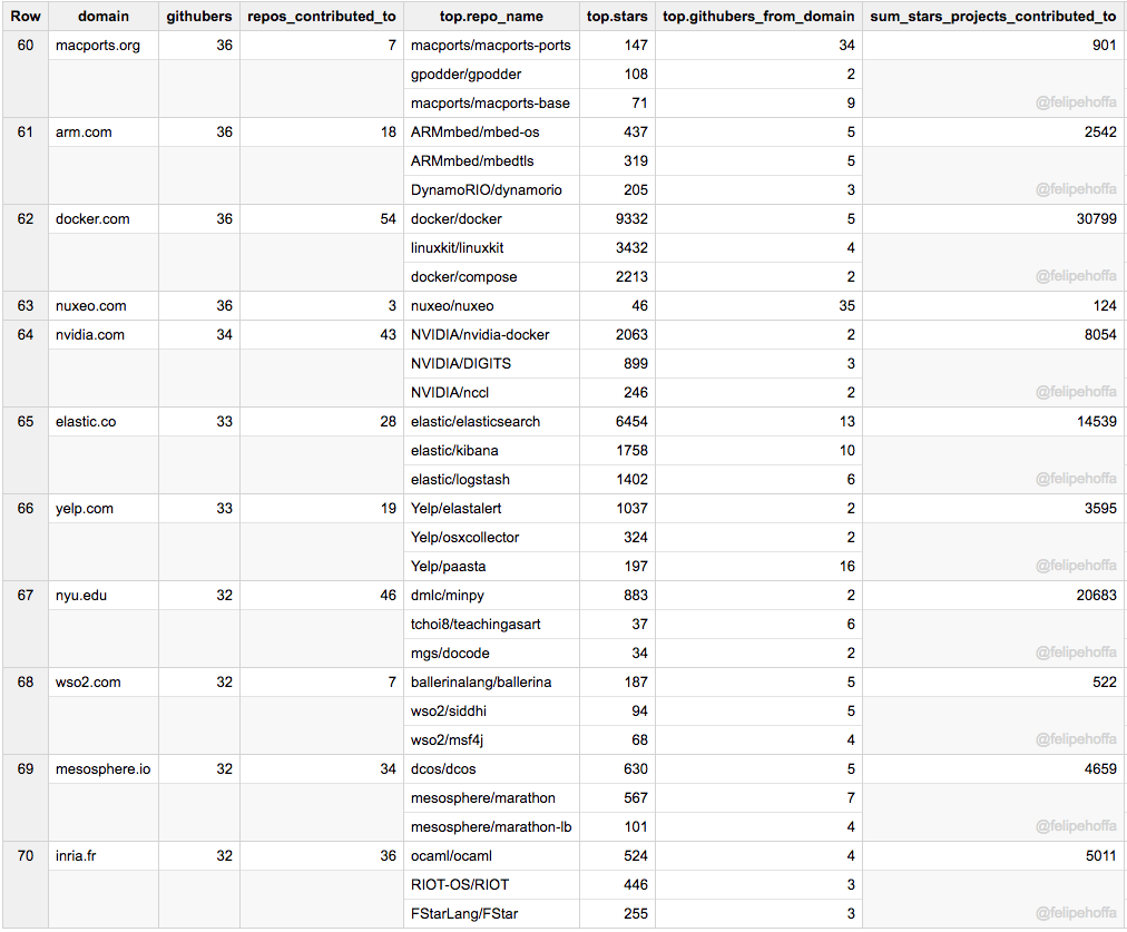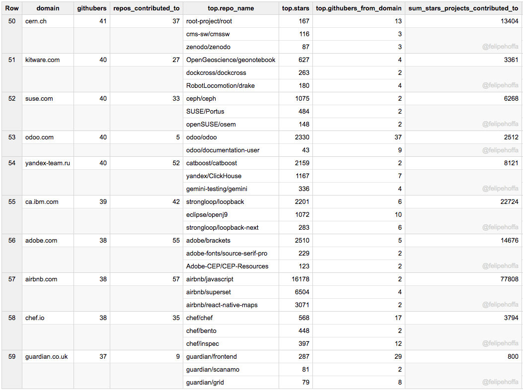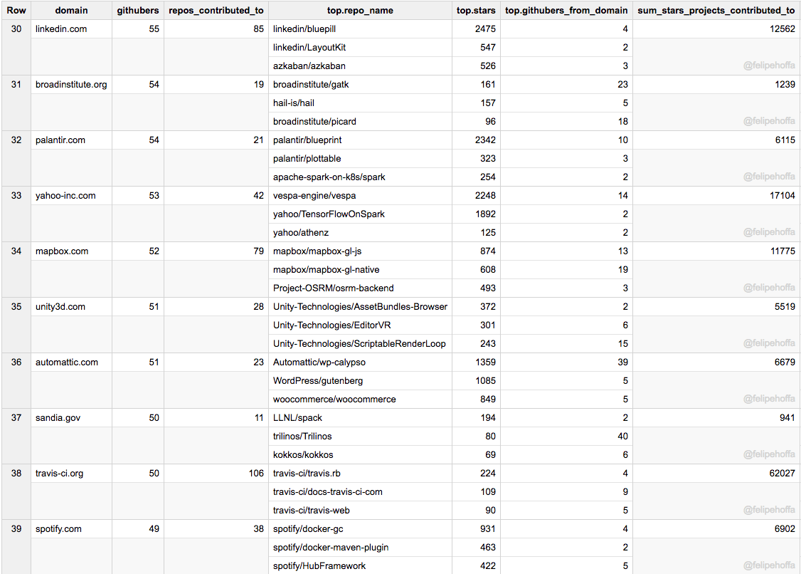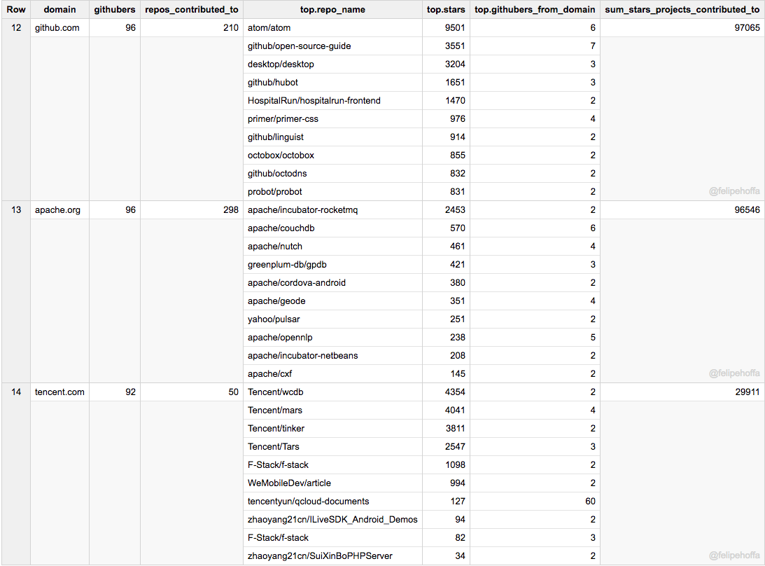 - 不是每个用户都在 GitHub 上使用其组织的邮件。有许多人使用 gmail.com、users.noreply.github.com 和其它邮件托管商的邮件地址。有时候这是为了保持匿名和保护其公司邮箱,但是如果我不能定位其公司域名,这些用户我就不会统计。抱歉。