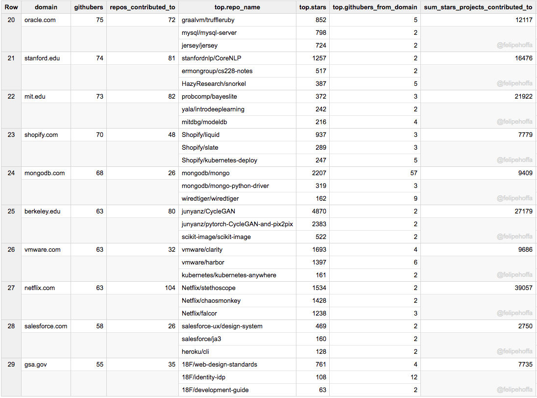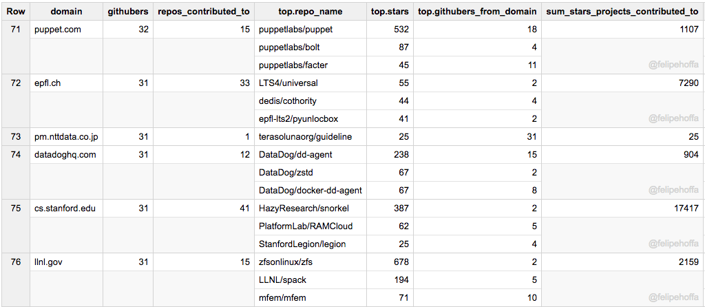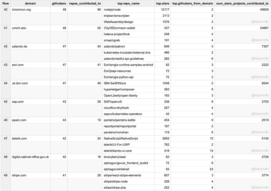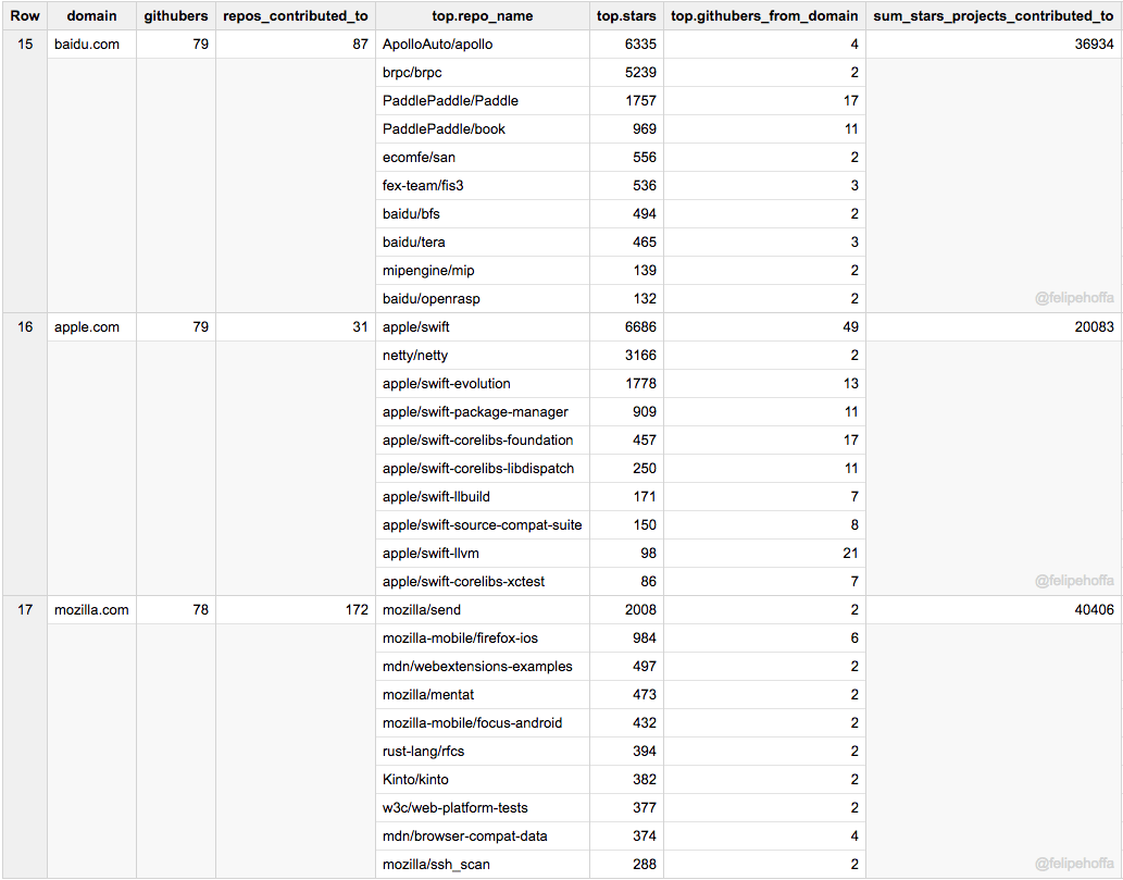 - 不是每个用户都在 GitHub 上使用其组织的邮件。有许多人使用 gmail.com、users.noreply.github.com 和其它邮件托管商的邮件地址。有时候这是为了保持匿名和保护其公司邮箱,但是如果我不能定位其公司域名,这些用户我就不会统计。抱歉。
