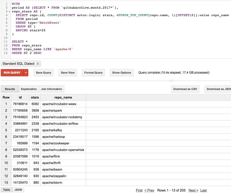 我进行了过滤。我只统计了 2017 年的星标。举个例子说,Apache 在 GitHub 上有超过 1500 个仓库,但是今年只有 205 个项目得到了超过 20 个星标。