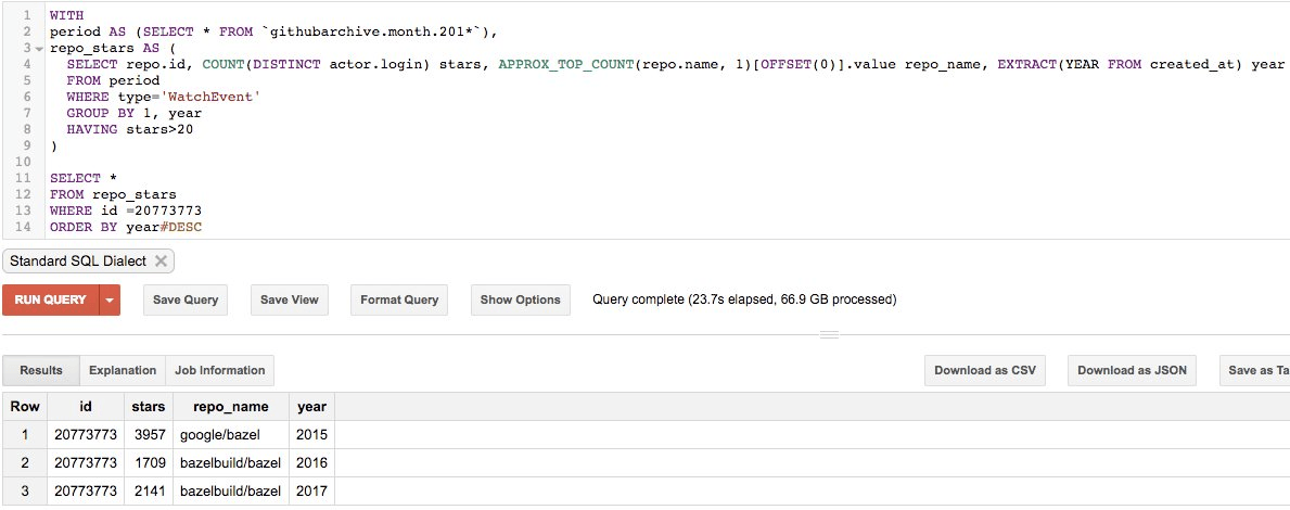 #standardSQL WITH period AS ( SELECT * FROM `githubarchive.month.2017*` a ), repo_stars AS ( SELECT repo.id, COUNT(DISTINCT actor.login) stars, APPROX_TOP_COUNT(repo.name, 1)[OFFSET(0)].value repo_name FROM period WHERE type='WatchEvent' GROUP BY 1 HAVING stars>20 ), pushers_guess_emails_and_top_projects AS ( SELECT * # , REGEXP_EXTRACT(email, r'@(.*)') domain , REGEXP_REPLACE(REGEXP_EXTRACT(email, r'@(.*)'), r'.*.ibm.com', 'ibm.com') domain FROM ( SELECT actor.id , APPROX_TOP_COUNT(actor.login,1)[OFFSET(0)].value login , APPROX_TOP_COUNT(JSON_EXTRACT_SCALAR(payload, '$.commits[0].author.email'),1)[OFFSET(0)].value email , COUNT(*) c , ARRAY_AGG(DISTINCT TO_JSON_STRING(STRUCT(b.repo_name,stars))) repos FROM period a JOIN repo_stars b ON a.repo.id=b.id WHERE type='PushEvent' GROUP BY 1 HAVING c>3 ) ) SELECT * FROM ( SELECT domain , githubers , (SELECT COUNT(DISTINCT repo) FROM UNNEST(repos) repo) repos_contributed_to , ARRAY( SELECT AS STRUCT JSON_EXTRACT_SCALAR(repo, '$.repo_name') repo_name , CAST(JSON_EXTRACT_SCALAR(repo, '$.stars') AS INT64) stars , COUNT(*) githubers_from_domain FROM UNNEST(repos) repo GROUP BY 1, 2 HAVING githubers_from_domain>1 ORDER BY stars DESC LIMIT 3 ) top , (SELECT SUM(CAST(JSON_EXTRACT_SCALAR(repo, '$.stars') AS INT64)) FROM (SELECT DISTINCT repo FROM UNNEST(repos) repo)) sum_stars_projects_contributed_to FROM ( SELECT domain, COUNT(*) githubers, ARRAY_CONCAT_AGG(ARRAY(SELECT * FROM UNNEST(repos) repo)) repos FROM pushers_guess_emails_and_top_projects #WHERE domain IN UNNEST(SPLIT('google.com|microsoft.com|amazon.com', '|')) WHERE domain NOT IN UNNEST(SPLIT('gmail.com|users.noreply.github.com|qq.com|hotmail.com|163.com|me.com|googlemail.com|outlook.com|yahoo.com|web.de|iki.fi|foxmail.com|yandex.ru', '|')) # email hosters GROUP BY 1 HAVING githubers > 30 ) WHERE (SELECT MAX(githubers_from_domain) FROM (SELECT repo, COUNT(*) githubers_from_domain FROM UNNEST(repos) repo GROUP BY repo))>4 # second filter email hosters ) ORDER BY githubers DESC