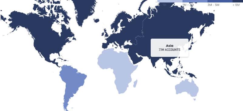 而这些开发者遍及全球:亚洲 710 万,北美 590 万,欧洲 530 万,等等。