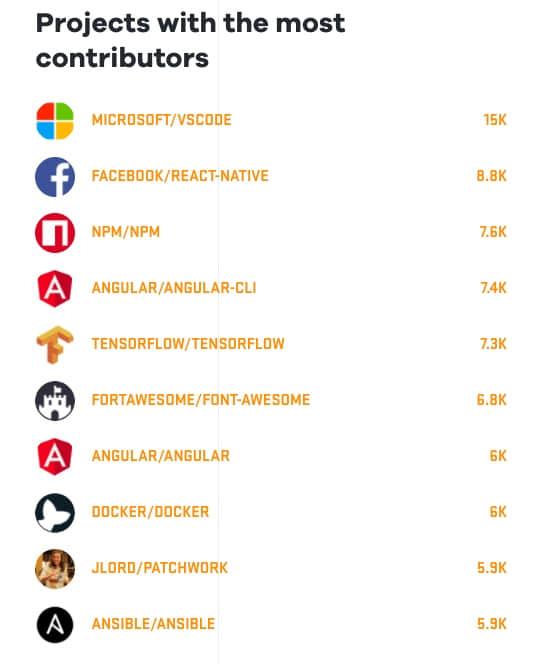 而以贡献者来说,微软的 vscode 项目的贡献者最多,几乎是排在第二名的 react-native 的两倍。这一方面证明了社区对 vscode 的喜爱,另外一方面也证明了微软在开源方面的重注投入。