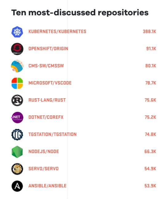 得到最多代码评议的项目是 Typescript 的一个类型定义库 DefinitelyTyped,第二名才是炙手可热的 Kubernetes。