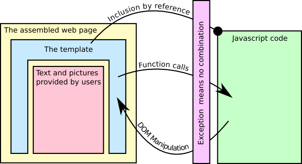 一些模板调用 JavaScript 函数。由于 JavaScript 通常是不一般的作品,因此它值得用左版保护。由于模板与用户数据相结合,因此模板 + 用户数据 + JavaScript 可能被版权法看作是一个作品。需要在 JavaScript(受左版保护)和用户代码(通常遵循不兼容的条款)之间划清界限。