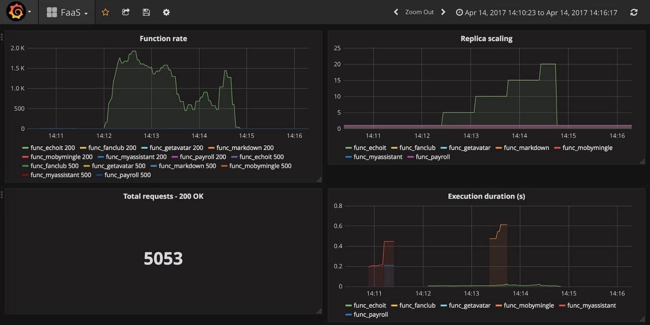 Prometheus 和 AlertManager 进程协同工作,实现 OpenFaaS Function 的弹性缩放,以满足业务需求。通过 Prometheus 指标我们可以查看系统的整体运行状态,还可以用来开发功能强悍的仪表盘。