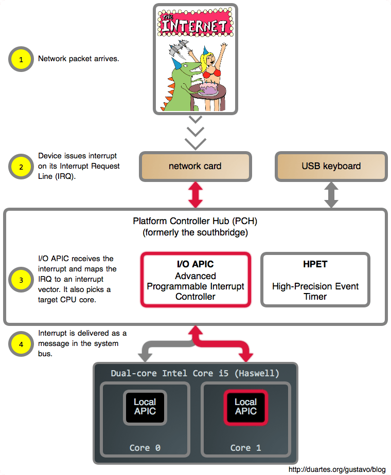 说到这里,让我们再来看一些实际情形。下图示意了 Intel Core i5 系统中的一个网卡中断。图片中的部分元素设置了超链,你可以点击它们以获取更为详细的信息,例如每个设备均被链接到了对应的 Linux 驱动源码。