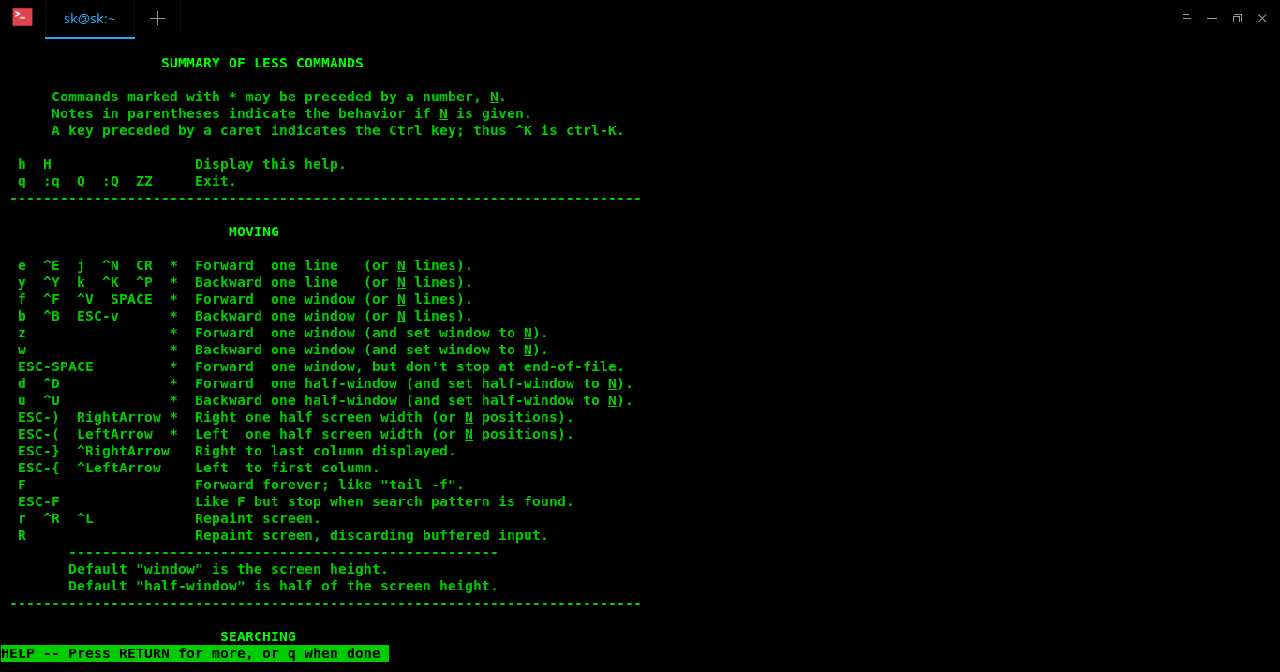 可以使用 空格,d,b 以及上下箭头等来浏览 man 页。要跳转道 man 页的末尾,可以按 End 键而想跳转到 man 页的头部则可以按 Home 键。在当前打开的 man 页中按下 h 键会显示所有有用的键盘快捷键和一般用法。(LCTT 译注:这些快捷键其实是 man 所使用的 less 分页器的快捷键)