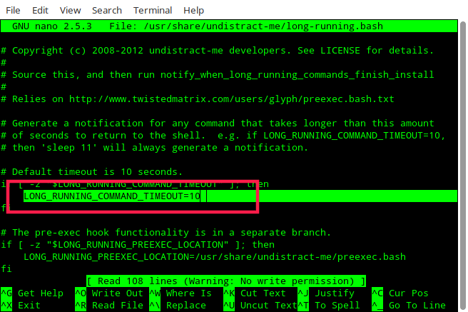 sudo nano /usr/share/undistract-me/long-running.bash