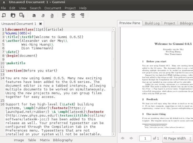 Gummi 是一个非常简单的 LaTeX 编辑器,它基于 GTK+ 工具箱。当然,在这个编辑器中你找不到许多华丽的选项,但如果你只想能够立刻着手写作, 那么 Gummi 便是我们给你的推荐。它支持将文档输出为 PDF 格式,支持语法高亮,并帮助你进行某些基础的错误检查。尽管在 GitHub 上它已经不再被活跃地维护,但它仍然工作地很好。