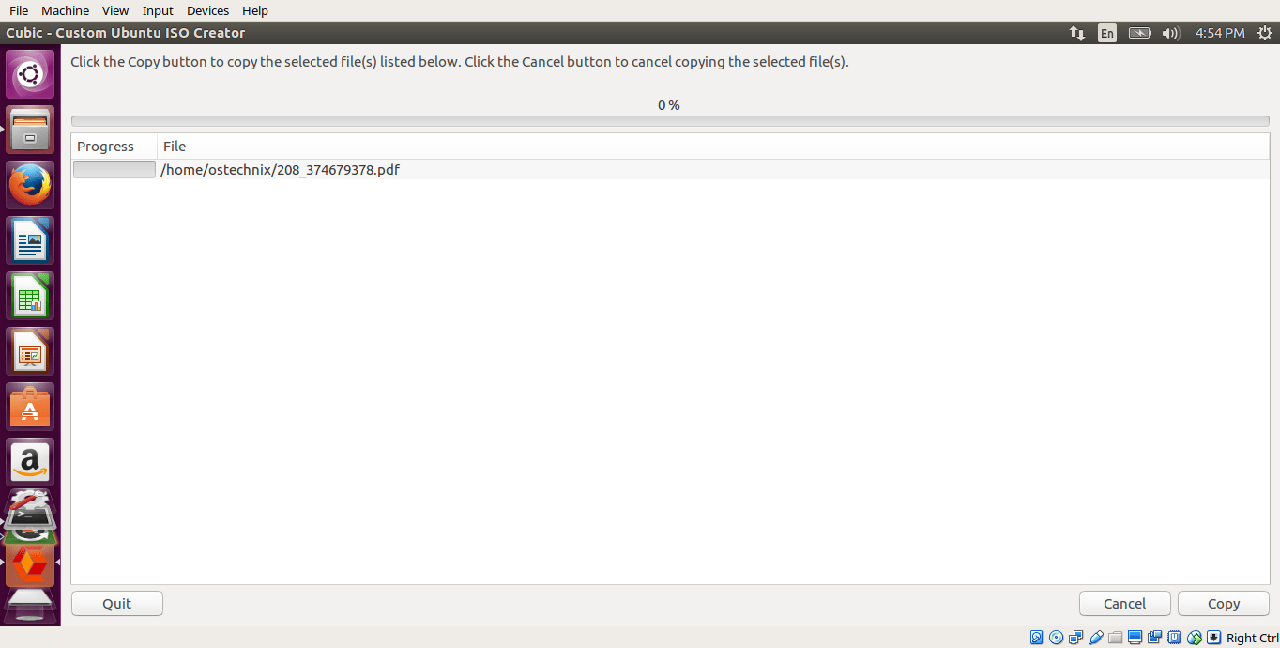 另外,您还可以向 Live CD 中添加文件或文件夹。复制文件或文件夹(右击它们并选择复制或者利用 CTRL+C),在终端右键单击(在 Cubic 窗口内),选择 “Paste file(s)”,最后点击 Cubic 向导底部的 “Copy”。