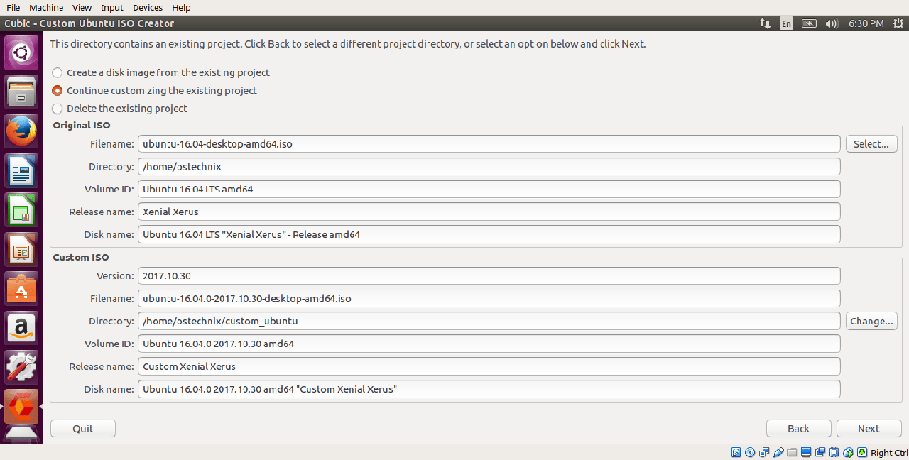 选择您存储 Ubuntu 安装 ISO 镜像的路径。Cubic 将自动填写您定制操作系统的所有细节。如果你愿意,你可以改变细节。单击 Next 继续。