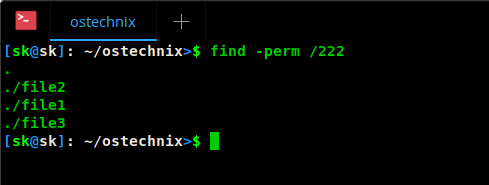 如你所见,命令行上显示两个文件。我们给 file2 设置了 766 权限,但是命令行显示两个文件,什么鬼?因为,我们设置了 - 参数前缀。它意味着这条命令将在所有文件中查找文件所有者的“读/写/执行”权限,文件用户组的“读/写”权限和其他用户的“读/写”权限。本例中,file1 和 file2 都符合要求。换句话说,文件并不一样要求时确切的 766 权限。它将会显示任何属于(高于)此权限的文件 。