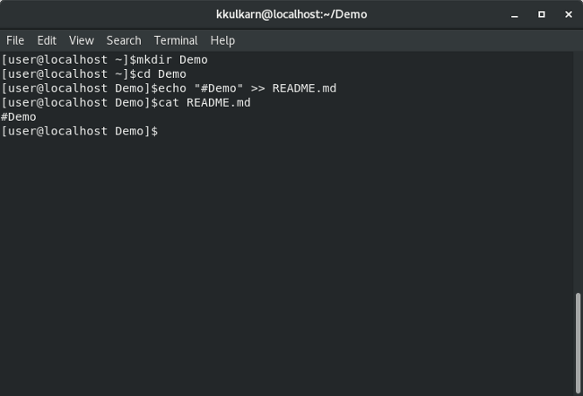创建一个名为 README.md 的文件,并写入 #Demo。检查文件是否创建成功,请输入: