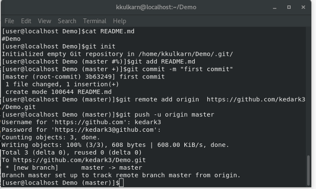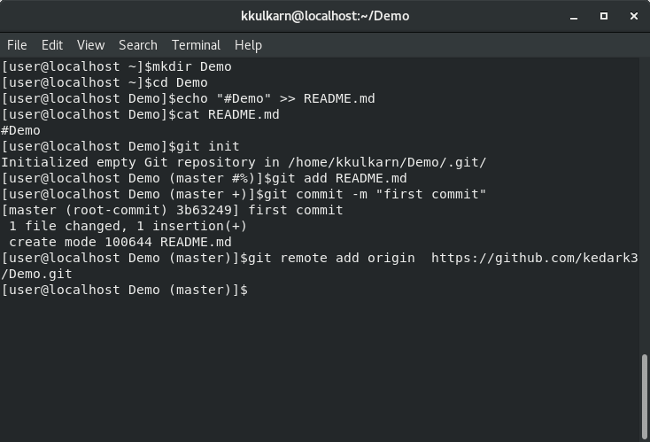 现在,我们已经将本地 Demo 仓库副本连接到了其在 GitHub.com 远程副本上。您的终端看起来如下: