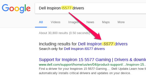 如果你知道笔记本电脑的制造商和型号,可以在 Google 中搜索它的驱动程序。我以前面的 Dell 游戏笔记本电脑为例。如果你知道它的名字,然后在 Google 上去搜索它的驱动程序(Dell Inspiron i5577-7342BLK-PUS drivers),Google 并不会显示一个 Dell 的官方的驱动程序页面。这并不奇怪,因为 Dell (以及其它制造商)在一个通用的型号名字下面,销售很多种装有各种不同的(2 到 3 种)硬件的笔记本电脑。因此,要缩小搜索目标,从左侧开始,我们首先来使用名字的前三个字段,并且用它在 Google(Dell Inspiron i5577 drivers)中搜索驱动程序,然后,如下所显示,并且,Google 也列出了不同的所属网站,对于 Inspiron 5577(没有 ‘i’),列出了一个 Dell 的官方驱动程序页面。