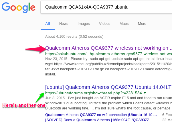 但是,高通的设备有时候可能会有些问题。我遇到过一两个,但是,它们都不是什么严重的问题。也就是说,当有问题时,去查找就是解决的一个好办法。因此,使用 Qualcomm QCA61x4A-QCA9377 做为关键字(使用一个适配器或者使用一个芯片名字的组合去查询这并不重要),并且增加一个像 linux 或者 ubuntu 这样的关键字在 Google 中去搜索它。如果像 Qualcomm QCA61x4A-QCA9377 ubuntu 这样去搜索,然后,Google 会列出很多结果。我收到的第一个结果是自来 AskUbuntu(一个社区驱动的网站,专门回答终端用户提出的问题,是一个解决 Ubuntu 相关问题的极好的资源)。