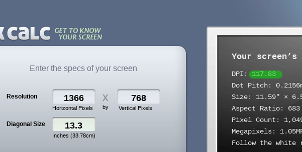 任何显示在你的屏幕上的东西,比如文本或者图标,都被设计为某些固定的大小。而这些大小是通过被称为 “每英寸显示的像素点数” 或者简称为 DPI 来描述的。它基本上定义了每英寸应该显示多少个点(像素)才能正确显示这个东西。每英寸显示 72 个点是由 Apple 公司制定的标准,这是很重要的。我相信,你可能听说过,Windows 使用了一个不同的标准,每英寸 96 个点,但是,它不完全正确。我不去深入其中的细节,但是,如果你想进一步了解更多的内容,阅读 Wikipedia。在任何情况下,要确保显示在你的 Linux 笔记本电脑的屏幕上的内容看起来清晰可读,如果你想了解,按以下的内容去做。首先,确定它的显示大小(13.3″、15.6″、17″…)和分辨率。然后到 PXCALC.com 网站,它提供一个非常好用的每英寸点数计算器。接着在上面输入正确的内容。计算完成后,它告诉你一个 DPI 的计算结果(在它的右上角,如下图所示)。然后将那个值简单地除以 72,这就是最重要的部分。