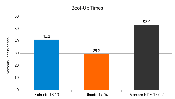 不管你使用的是什么操作系统,增加一块 SSD 将能提升你的笔记本电脑的整体性能和反应速度,因为它比起普通的机械硬盘来说速度快很多,就这么简单。也就是说,在我的经验中,即便是高效和轻量化的 KDE 发行版,相比 GNOME 要花更多的启用时间。一些 Linux 发行版,比如 Ubuntu 和 Kubuntu 带着一个特别设计的被称为 'ureadahead' 的实用程序,它可以改善启动时间(有时可以达到 30% 甚至更多),不幸的是,并不是所有的发行版都有这类工具。在有些时候,安装在 SATA 驱动器上的 KDE 的启动时间可能长达 50 秒以上。Manjaro 17.0.2 KDE 就是其中一个这样的例子(显示在上面的图表中)。