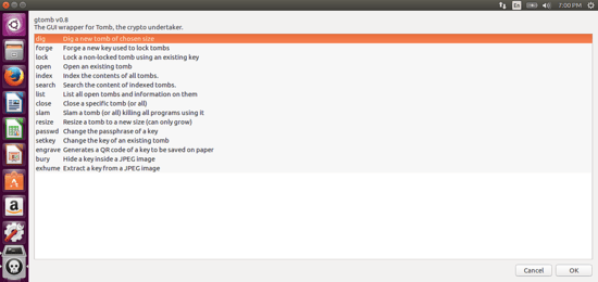 最后,它有几个先进的功能,如 隐写术 ,这使你可以将你的关键文件隐藏在其他文件中。 尽管 Tomb 主要是一个命令行工具,它也带有 GUI 界面—— gtomb,它允许初学者用图形化的方式使用它。