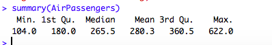 数据导入后,我使用 summary(AirPassengers) 命令获取数据的一些初始描述性统计信息。按回车键后,我得到了 1949-1960 年的每月航空公司旅客的摘要以及其他数据,包括飞机乘客数量的最小值、最大值、四分之一位数、四分之三位数、中位数以及平均数。