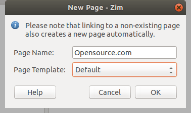 在 Zim 中的一个关键概念是 笔记本 ,它们就像某个单一主题的维基页面的集合。当你第一次启动 Zim 时,它要求你为你的笔记本指定一个文件夹和笔记本的名称。Zim 建议用 Notes 来表示文件夹的名称和指定文件夹为 ~/Notebooks/。如果你愿意,你可以改变它。我是这么做的。