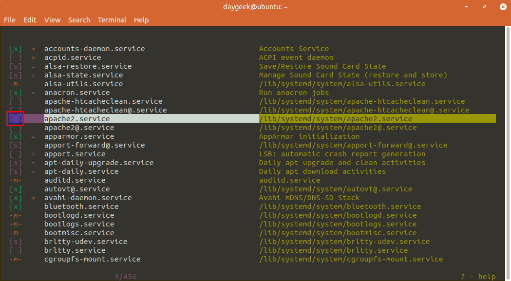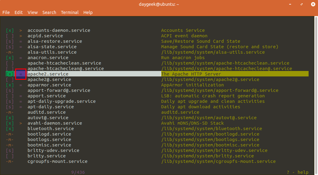 • 第一部分: 这一部分显示了守护进程的状态,比如可用的 [X] 或者不可用的 [ ] 或者静态的 [s] 或者被掩藏的 -m-