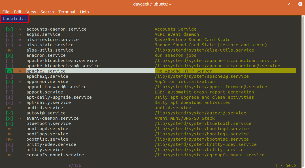 选择要重新启动的守护进程,然后按下 r,之后,您可以在顶部看到更新的提示。