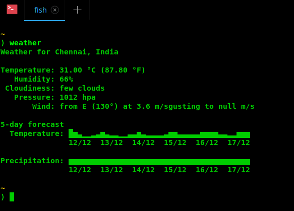 现在,在 Fish shell 中使用以下命令查看天气: