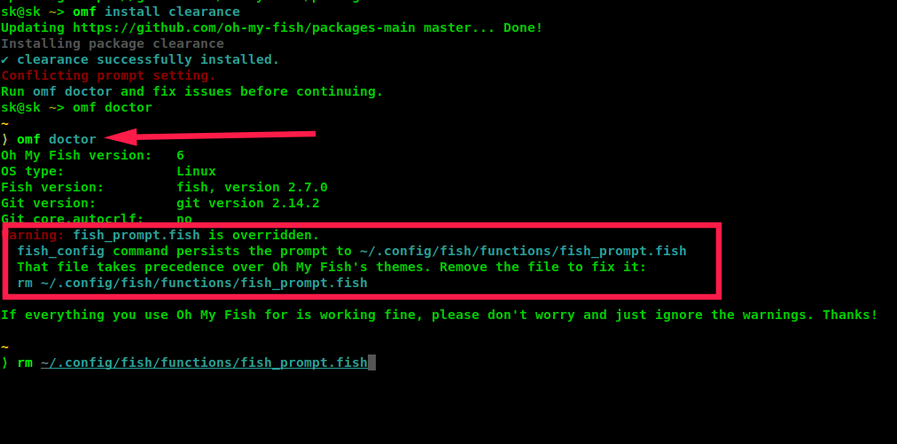 如果出现了错误,omf 足够聪明来帮助你,它可以列出解决问题的方法。例如,我安装了 clearance 包,得到了文件冲突的错误。幸运的是,在继续之前,Oh My Fish 会指示我该怎么做。因此,我只是简单地运行了以下代码来了解如何修正错误。