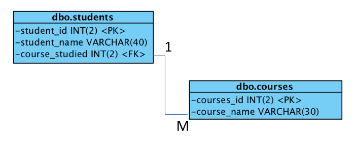 CREATE TABLE dbo_students ( student_id INT(2) AUTO_INCREMENT NOT NULL, student_name VARCHAR(50), course_studied INT(2), PRIMARY KEY (student_id) ); CREATE TABLE dbo_courses ( course_id INT(2) AUTO_INCREMENT NOT NULL, course_name VARCHAR(30), PRIMARY KEY (course_id) ); ALTER TABLE dbo_students ADD CONSTRAINT FK_course_studied FOREIGN KEY (course_studied) REFERENCES dbo_courses(course_id); INSERT INTO dbo_courses(course_id,course_name) VALUES(001,'Software Engineering'); INSERT INTO dbo_courses(course_id,course_name) VALUES(002,'Computer Science'); INSERT INTO dbo_courses(course_id,course_name) VALUES(003,'Computing'); INSERT INTO dbo_students(student_id,student_name,course_studied) VALUES(001,'student1',001); INSERT INTO dbo_students(student_id,student_name,course_studied) VALUES(002,'student2',002); INSERT INTO dbo_students(student_id,student_name,course_studied) VALUES(003,'student3',002); INSERT INTO dbo_students(student_id,student_name,course_studied) VALUES(004,'student4',003); SELECT * FROM dbo_courses