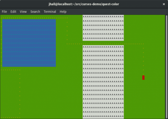 通过颜色,你可以更清楚地展示信息。这个例子使用颜色指出可游戏的区域(绿色)相对着不可通过的区域(蓝色或者灰色)。我希望你可以使用这个示例游戏作为你自己的程序的一个起点或者参照。这取决于你需要你的程序做什么,你可以通过 curses 做得更多。