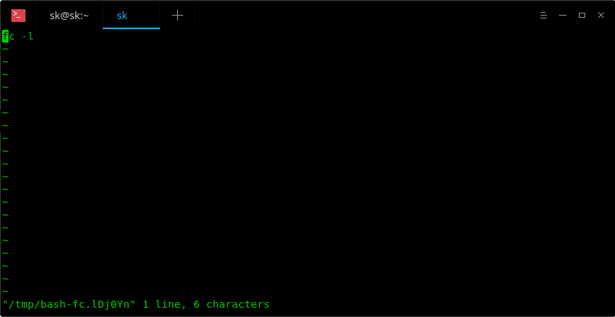 $ fc -ln nano ~/.profile source ~/.profile source ~/.profile fc -ln fc -l sudo netctl restart wlp9s0sktab ls -l pwd uname -r uname -a echo "Welcome to OSTechNix" sudo apcman -Syu cat ostechnix.txt wc -l ostechnix.txt more ostechnix.txt clear