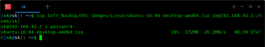 $ scp Soft_Backup/OS\ Images/Linux/ubuntu-16.04-desktop-amd64.iso sk@192.168.43.2:/home/sk/