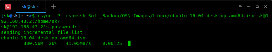 $ rsync --partial -rsh=ssh Soft_Backup/OS\ Images/Linux/ubuntu-16.04-desktop-amd64.iso sk@192.168.43.2:/home/sk/