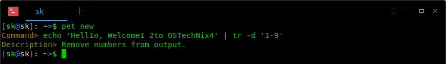 $ pet new -t Command> echo 'Hell1o, Welcome1 2to OSTechNix4' | tr -d '1-9 Description> Remove numbers from output. Tag> tr command examples