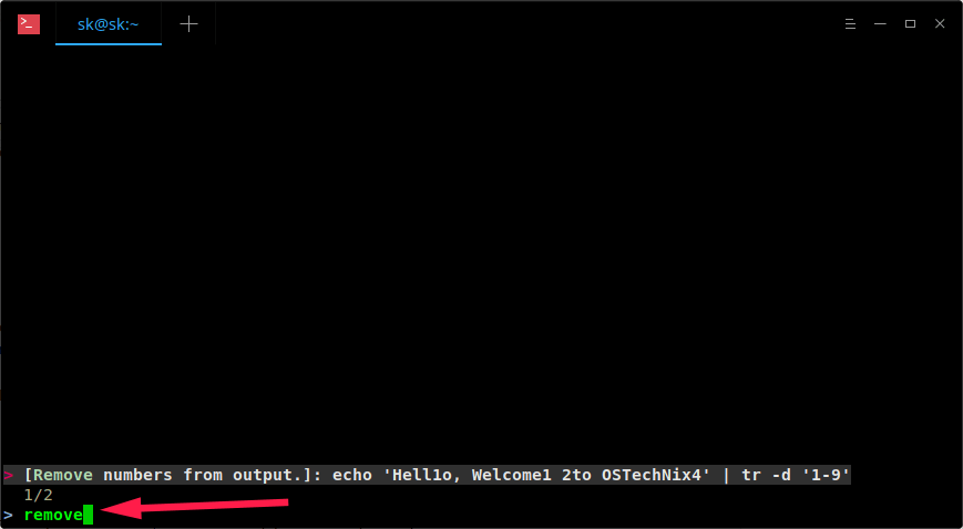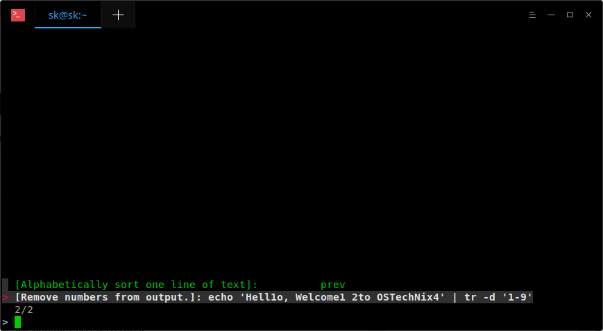 [[snippets]] description = "Remove numbers from output." command = "echo 'Hell1o, Welcome1 2to OSTechNix4' | tr -d '1-9'" output = "" [[snippets]] description = "Alphabetically sort one line of text" command = "\t prev" output = ""
