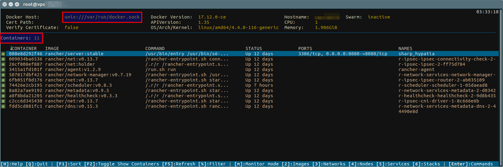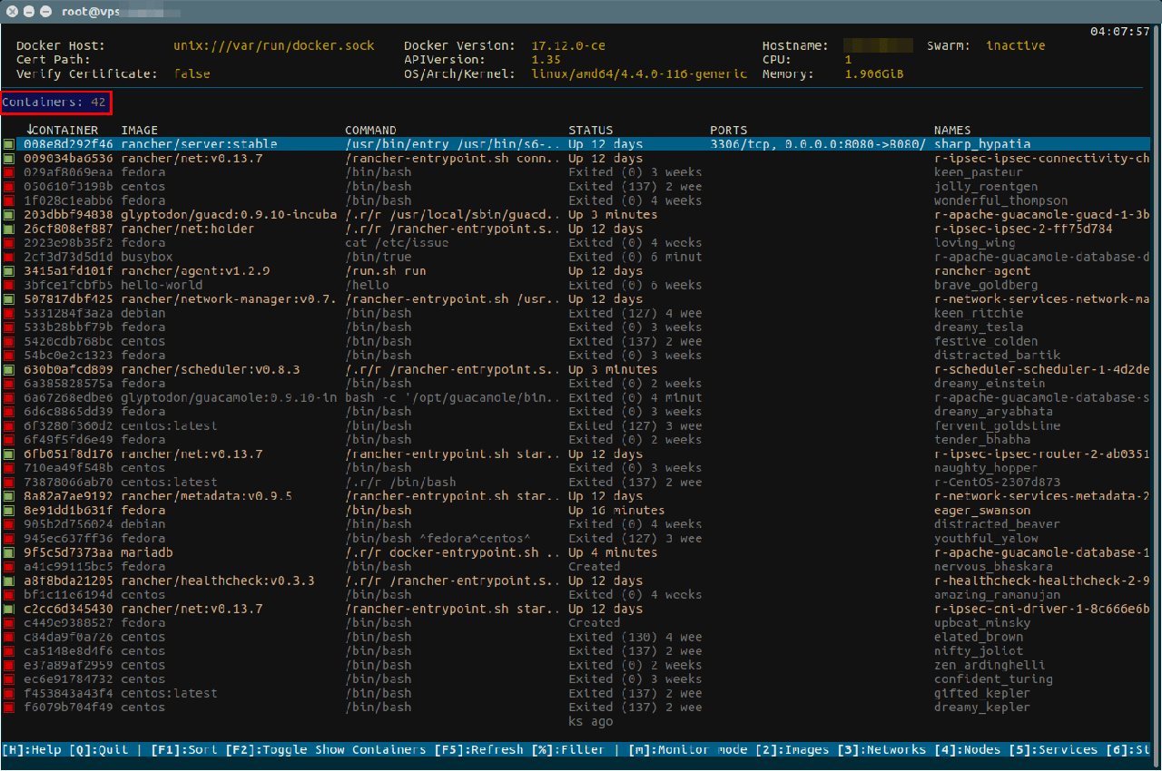 按下 F2 键即可列出列出全部容器,包括运行中和已关闭的容器。