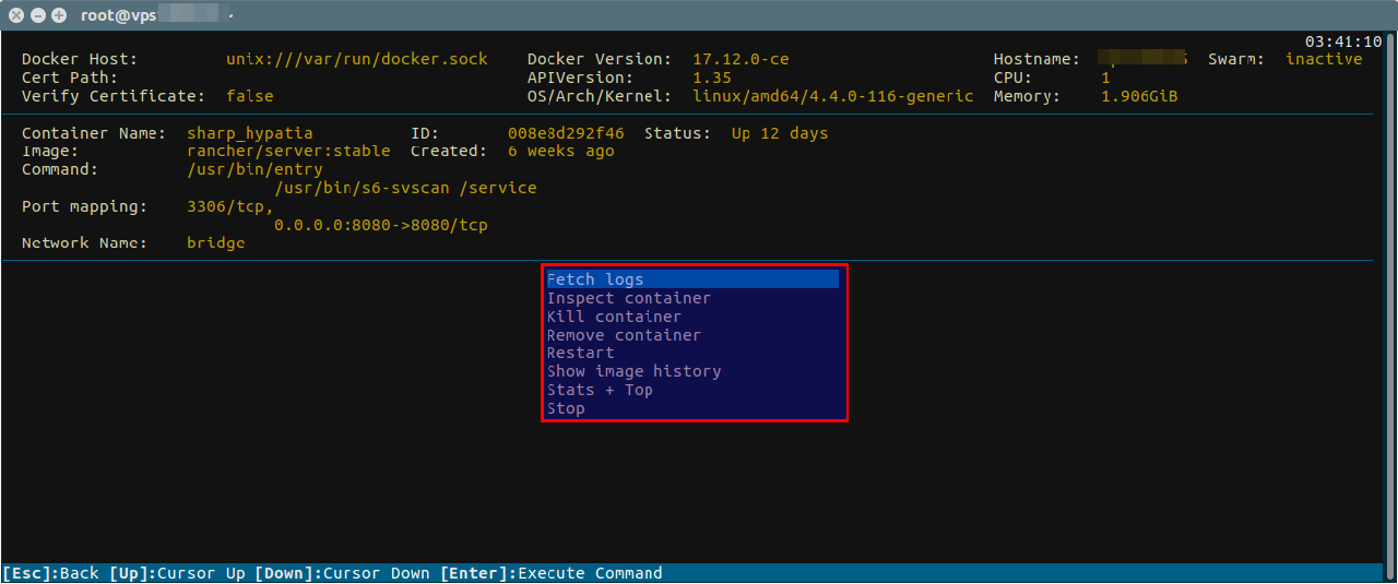 在选中的容器上单击回车键,即可管理容器。Dry 提供如下操作:查看日志,查看、杀死、删除容器,停止、启动、重启容器,查看容器状态及镜像历史记录等。