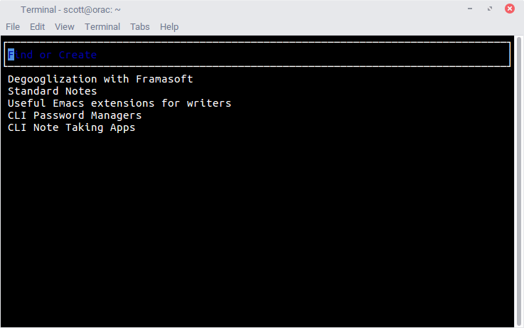 使用键盘上的箭头键滚动查看你的笔记列表。要查看或编辑笔记,请按回车键。如果你有一长串笔记,则可以在 Find or Create 字段中输入笔记标题的前几个字符以缩小列表的范围。在那里滚动笔记并按下回车键将其打开。