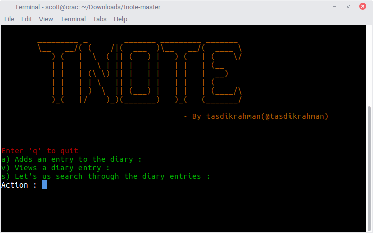 tnote 是一个 Python 脚本。首次启动时,它会要求你输入密码和口令来加密存储笔记的 SQLite 数据库。完成之后,按 A 创建一个笔记。输入你的笔记,然后按 CTRL-D 保存。