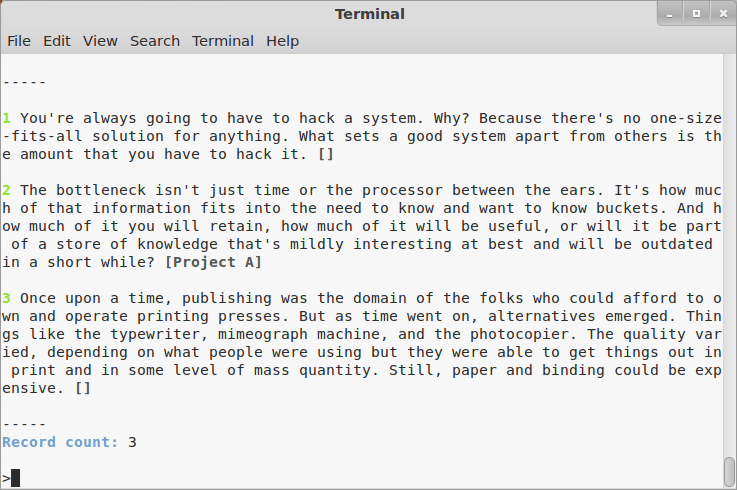 像 tnote 一样,pygmynote 将你的笔记和附件保存在 SQLite 数据库中。当你启动它时,pygmynote 看起来并不特别有用。在任何时候,输入 help 并按下回车键获取命令列表。
