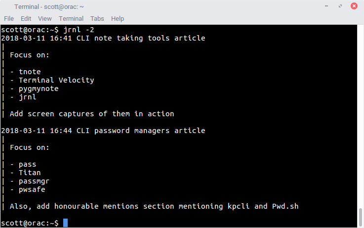 jrnl 是这里的一个奇怪应用。正如你可能从它的名字中猜到的那样,jrnl 意在成为一种日记工具。但这并不意味着你不能记笔记。 jrnl 做得很好。