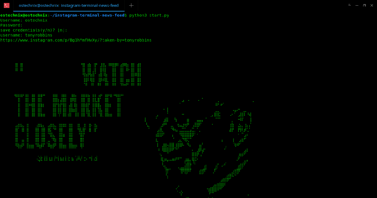 输入你的 Instagram 用户名和密码,并直接从终端中浏览你的 Instagram feed。你的 instragram 用户名和密码将仅本地存储在名为 credential.json 的文件中。所以,你不必担心它。你也可以选择不保存默认保存的凭证。